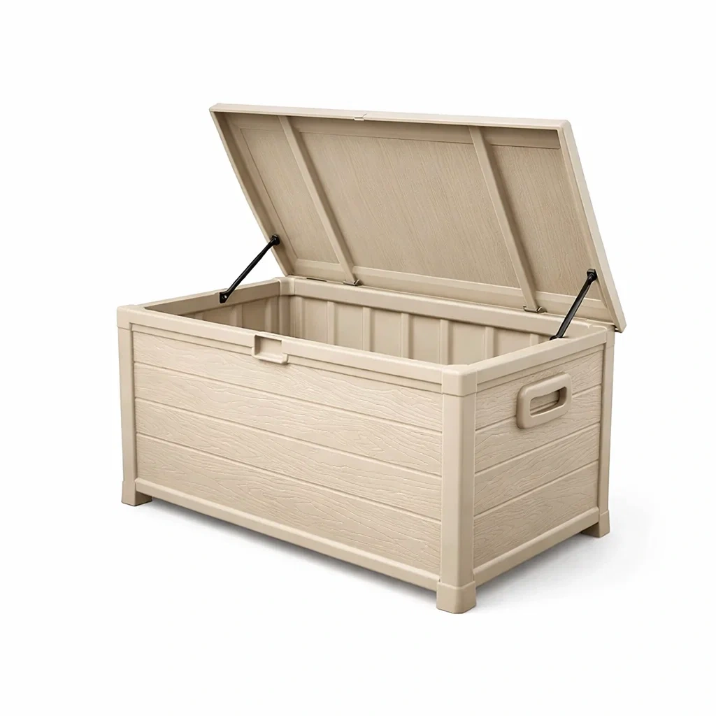 Ce coffre de rangement est fabriqué en plastique résistant, idéal pour une utilisation en extérieur.