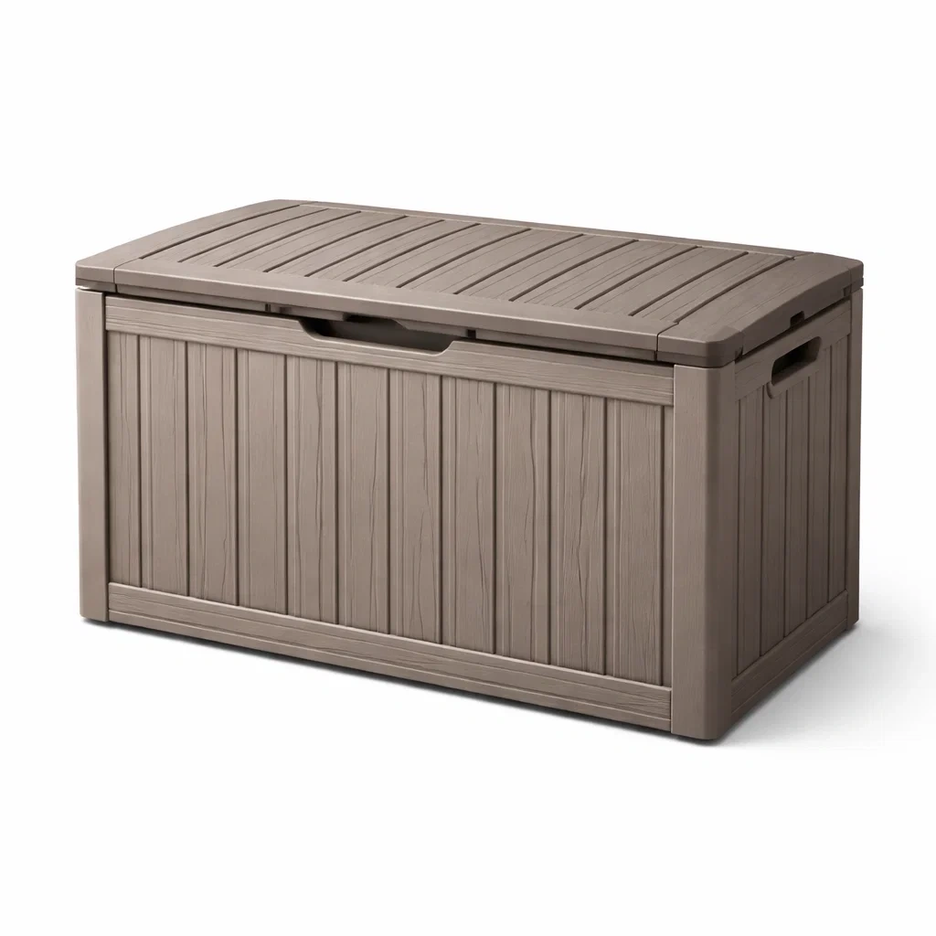 Ce coffre de rangement extérieur est fabriqué en polypropylène, un matériau résistant aux intempéries.