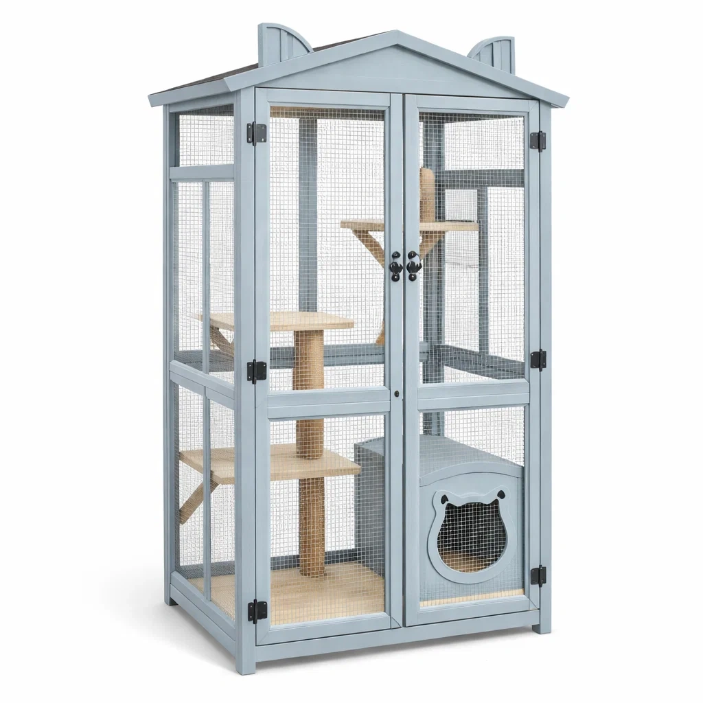 Enclos pour chats fabriqué en bois de pin et grillage métallique.