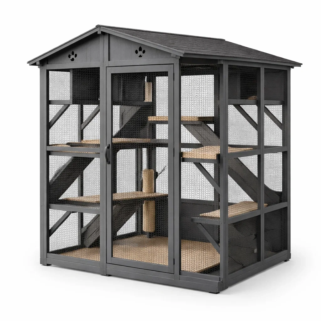 Enclos en bois de sapin avec du fil métallique durable, conçu pour fournir un habitat sécurisé aux chats.