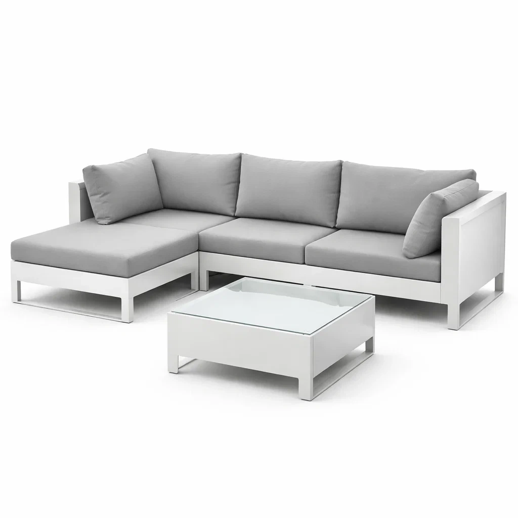 Ensemble de canapé d’angle en aluminium avec coussins en polyester gris et table basse en verre